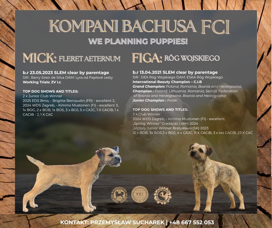Zapowiedź miotu – szczenięta Border Terrier Z radością informujemy, że w naszej hodowli wkrótce pojawią się szczenięta border terrier !Rodzicami zostaną wyjątkowe psy – Figa Róg Wojskiego oraz Mick Fleret Aeternum. To połączenie najlepszych linii hodowlanych gwarantuje szczenięta o doskonałym eksterierze, świetnym charakterze i dużym potencjale wystawowym. Matka – FIGA